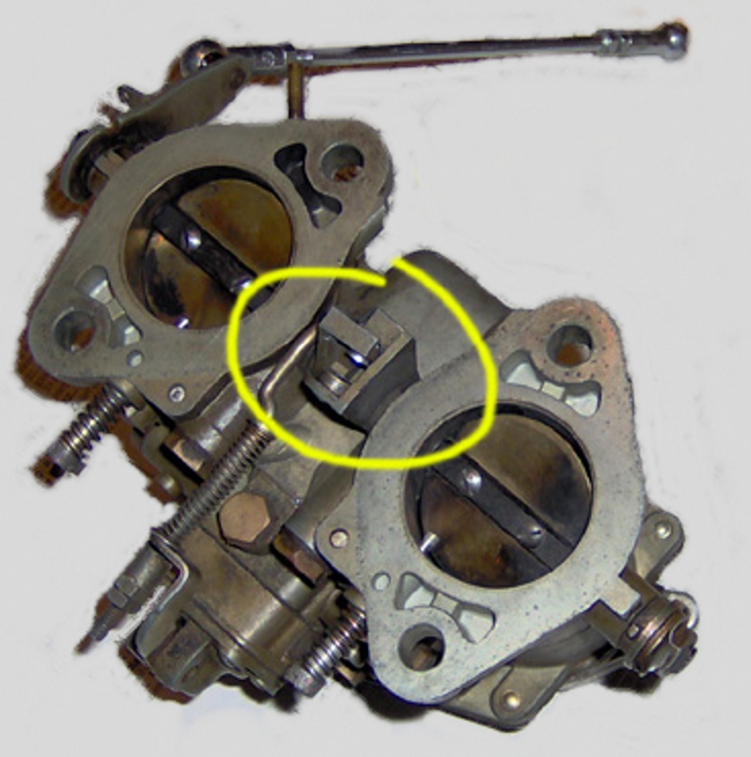 Conversion carburetors: note shaft bushings that are not on standard solid shaft carburetors as well as throttle link set up. All other hardware is standard to the split shaft.